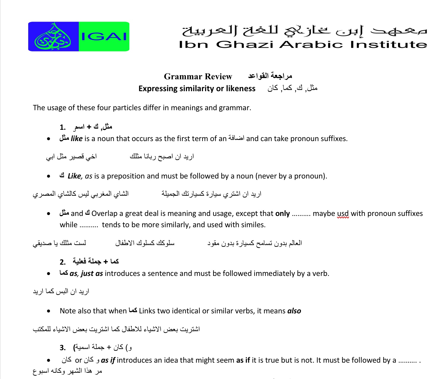 Expressing similarity or likeness in Arabic مثل, ك, كما, كان